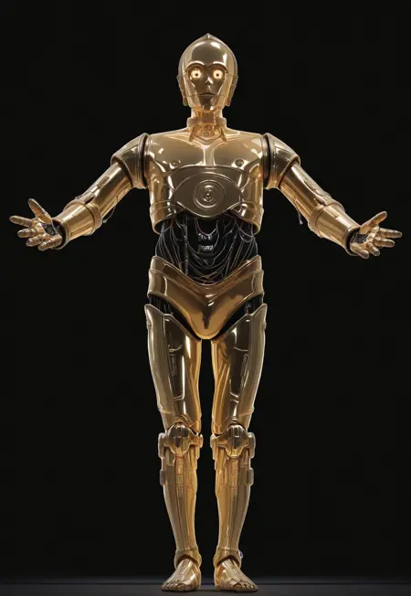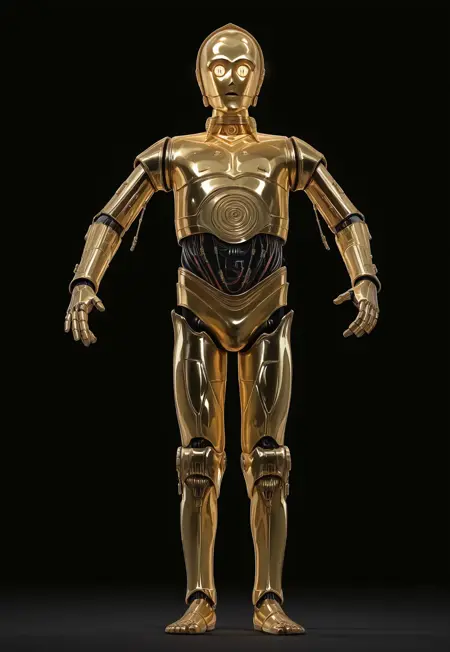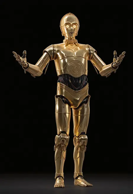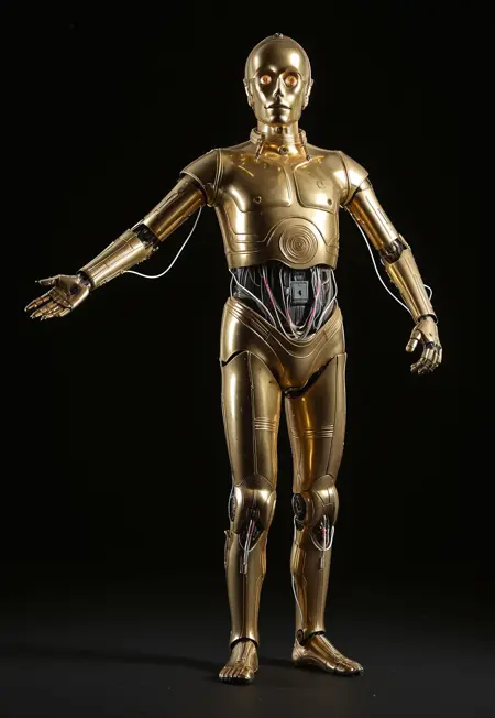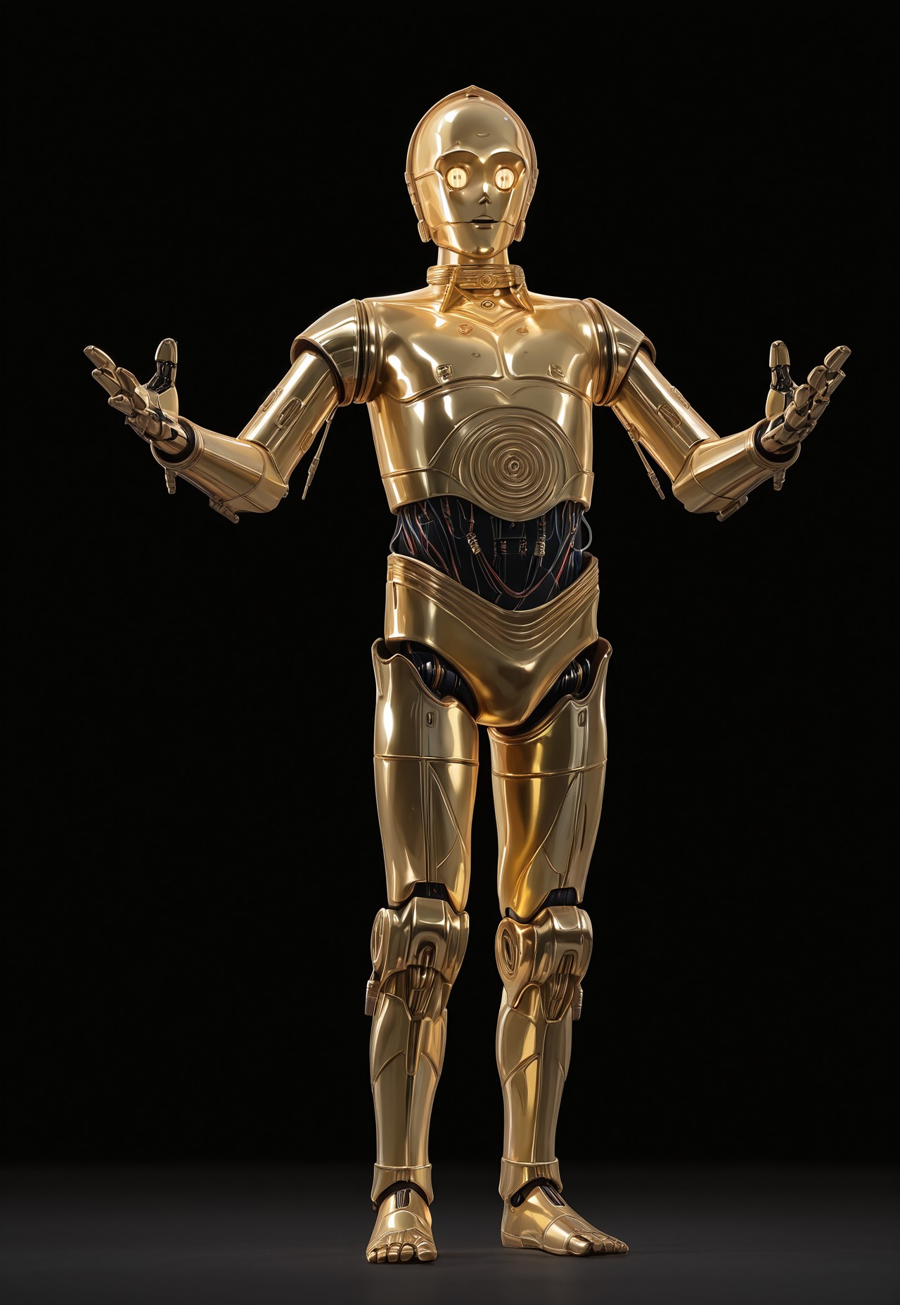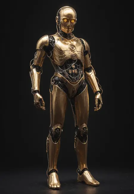 # c3po, android, robot male, golden metallic skin, golden glowing eyes, black midriff with wiring,