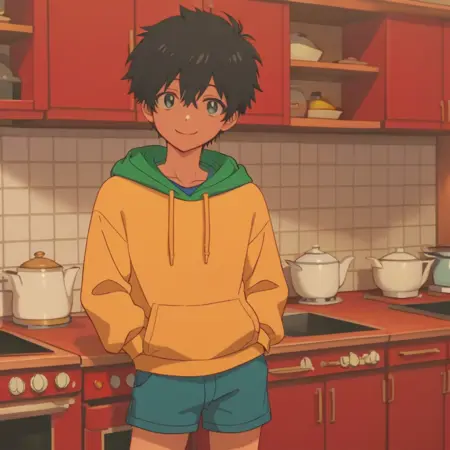 提示词:男性,黑发,黑眼睛,多色眼睛,黄色连帽衫,绿色帽兜,长袖,蓝色背心,蓝色短裤,运动鞋,室内(餐厅/桌子/椅子/托盘/食物/杯子/窗户/景色),室内(厨房/炉子/架子/冰箱),室外(天空/云/建筑/窗户/树/公寓/电线杆/电线)