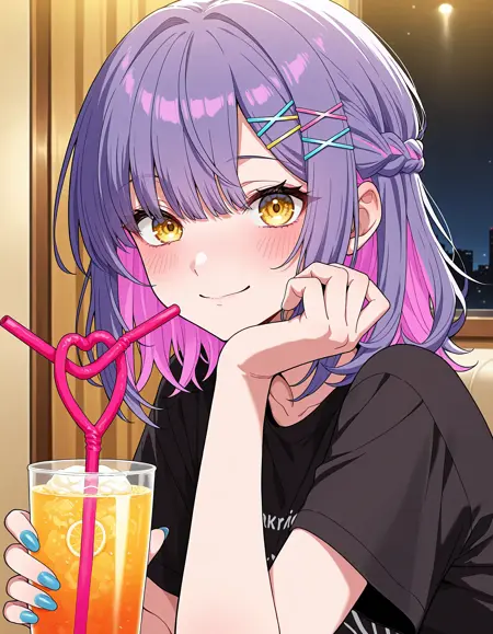 medium hair, purple hair, pink inner hair, hairclip, x hair ornament, french braid