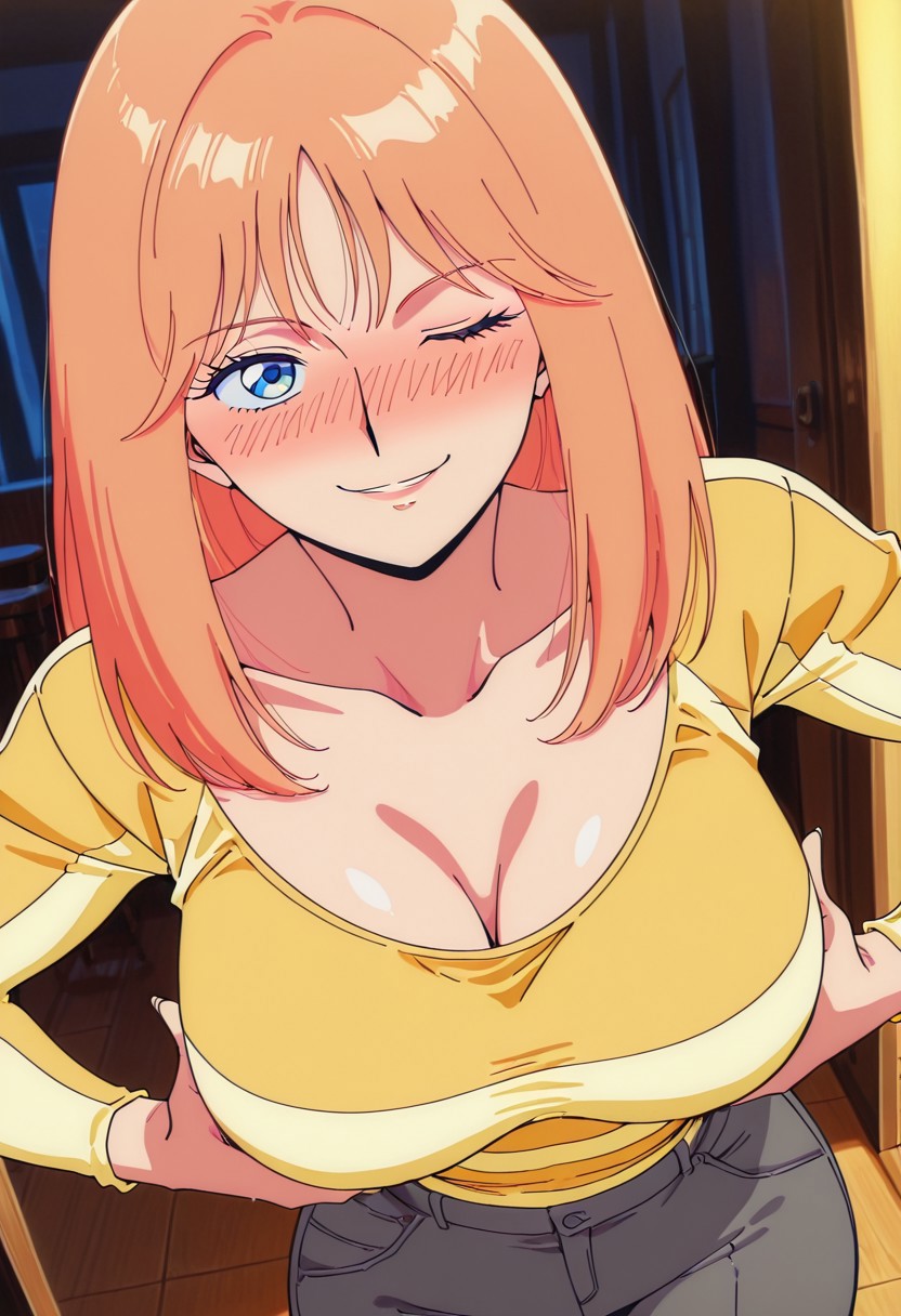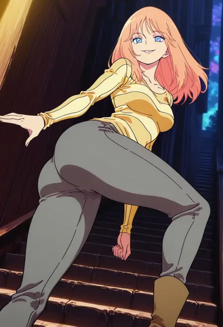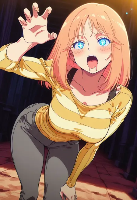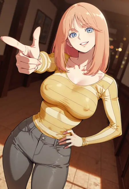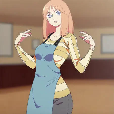 FlareMS, 1소녀, 싱글, 옅은 주황색 머리카락, 긴 머리, 앞머리, 옅은 파란색 눈, 입술, 큰 가슴, 두꺼운 허벅지, 어깨뼈, 노란색 줄무늬 셔츠, 파란색 앞치마, 회색 바지, 부츠,