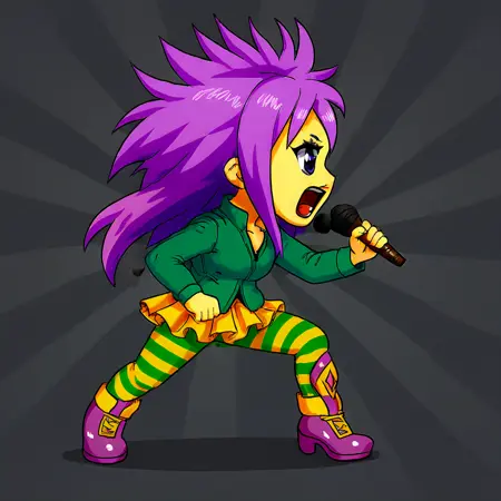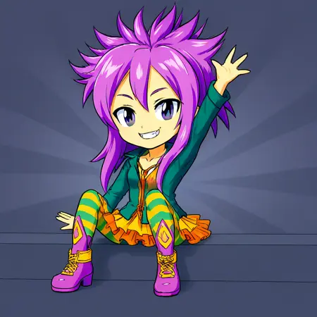 1girl,solo, purple eyes, purple hair,long hair,spiked hair, jacket,skirt,striped pantyhose, Boots