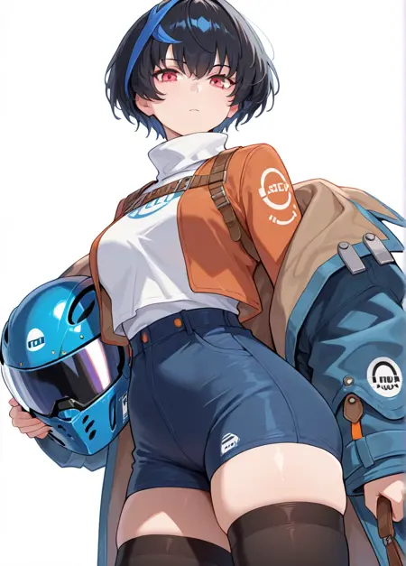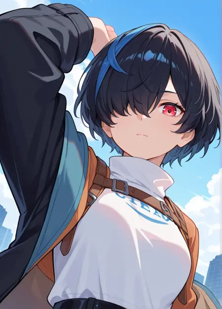 unikaxd, 1girl, red eyes, black hair, short hair, multicolored hair, streaked hair, blue hair, bangs, hair between eyes,