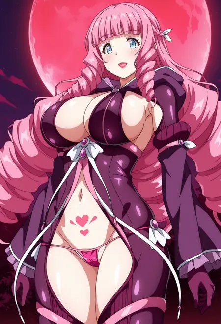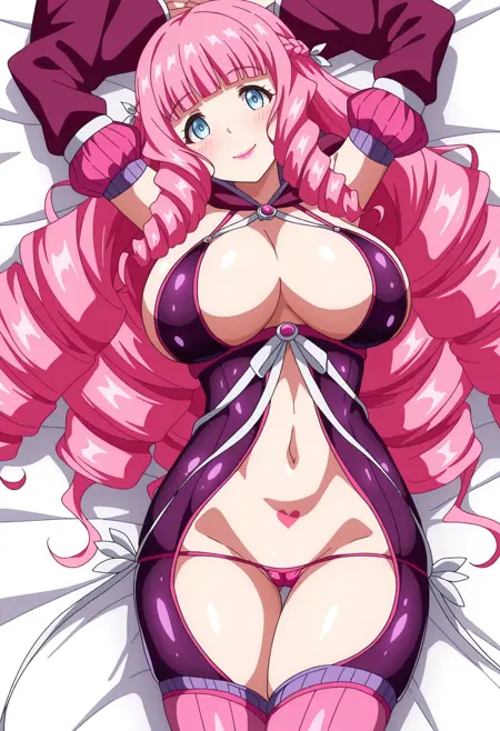 • corruption, lipstick, pink hair, drill hair, very long hair, half up braid, hair ribbon, hood down, revealing clothes, bodysuit, purple bodysuit, sideboob, white ribbon, detached sleeves, purple sleeves, gloves, pelvic tattoo, heart tattoo, center opening, pink panties, micro panties, lowleg panties, thigh cutout,