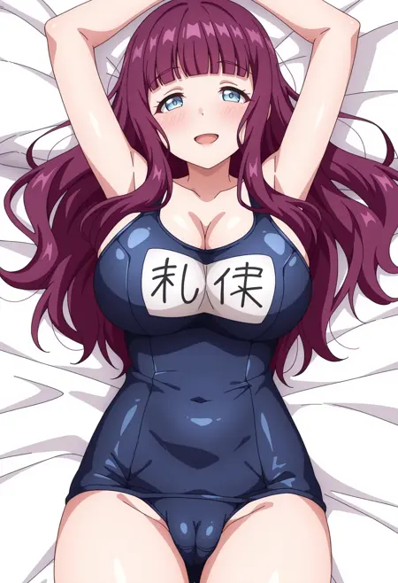 • msututea, long hair, blue eyes, tareme, blunt bangs, large breasts,