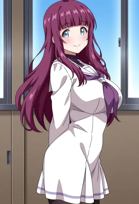 • serafuku, purple hair, purple neckerchief, white dress, turtleneck, school uniform, long sleeves, pantyhose,
