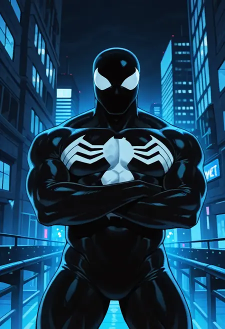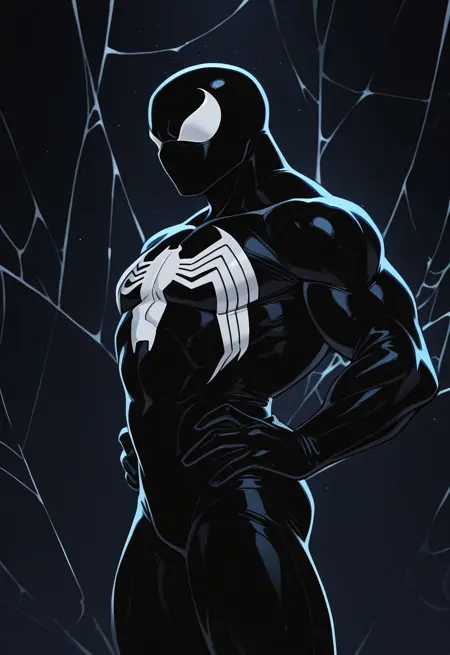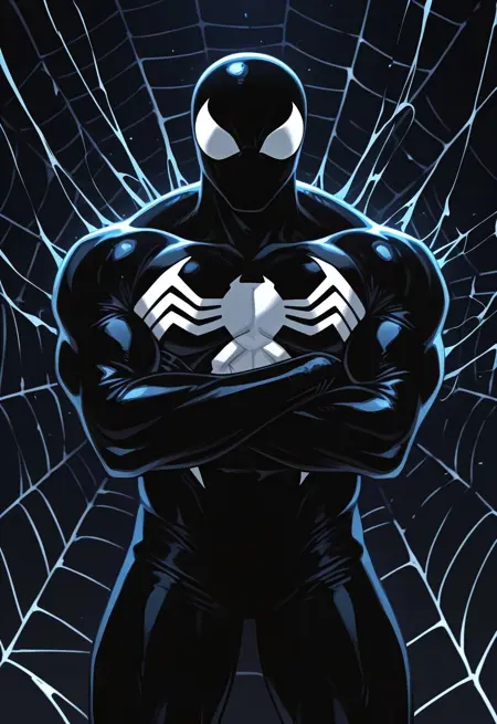 tasspidersymbXL/(marvel)/, symbiote, bodysuit, blacksuit, mask, spiderprint, whiteprint, muscular, 1boy, solo,