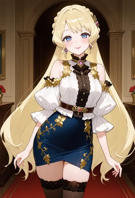 흰 셔츠, 꽃 장식, 꽃 테두리, 브로치, 중앙 프릴, 검은 프릴, 금 테두리, 꽃 테두리, 어깨 노출, 어깨 드러냄, 퍼프 소매, 허리 아래, 벨트, 파란 치마, 연필 치마, 허벅지까지 오는 스타킹,