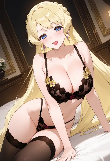 atmireille, 금발, 매우 긴 머리, 파란 눈, 머리 장식, 립스틱, 땋은 머리, 귀걸이,