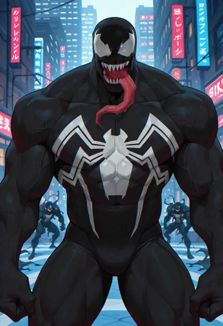 spectacular_venom/(marvel)/IL, bodysuit, blacksuit, mouth, spiderprint, muscular, 1boy, solo, sharp teeth, monsterboy, long tongue, symbiote, big muscles, big pecs, pecs, large pectorals, huge muscles, huge pecs, mature male,