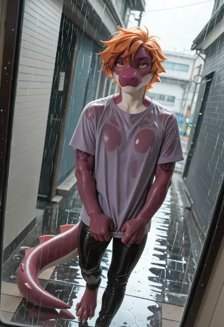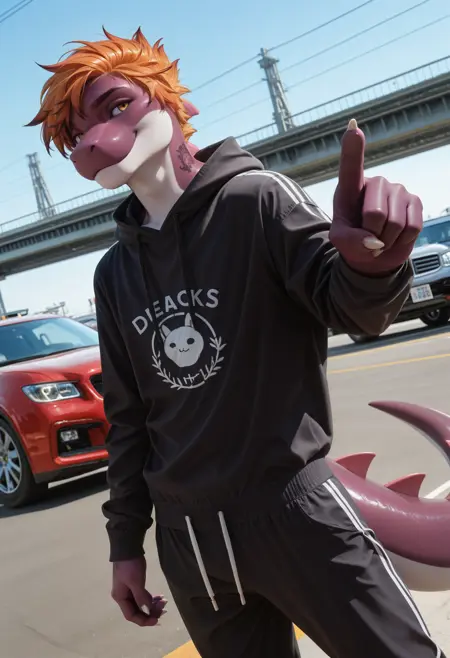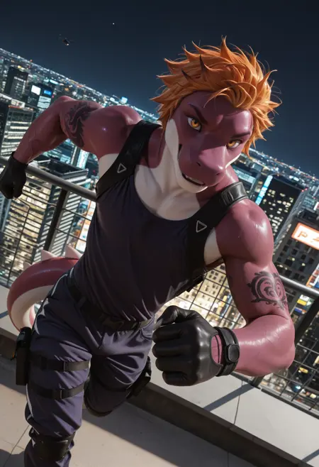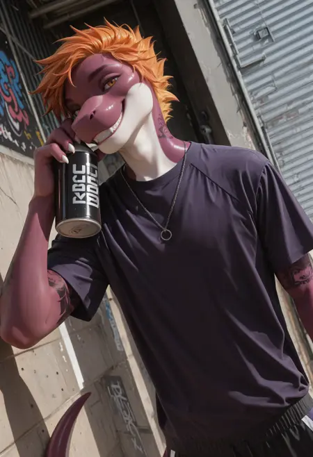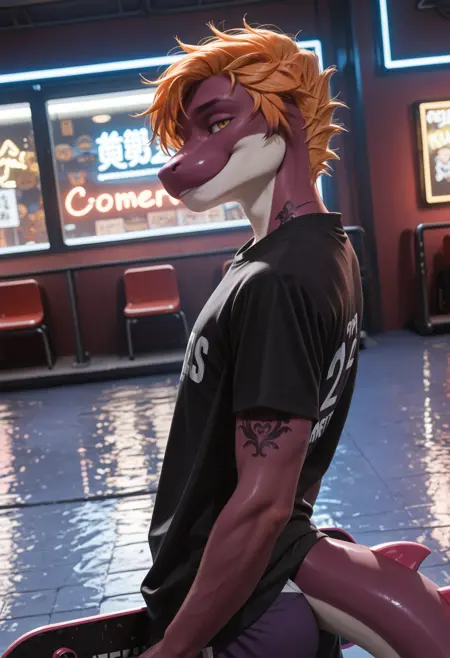 daxx3_y0shi, colored skin, tail, male focus, furry, 1boy, solo, tattoo, short hair, orange hair, yellow eyes, looking at viewer, furry male, purple skin, white claws