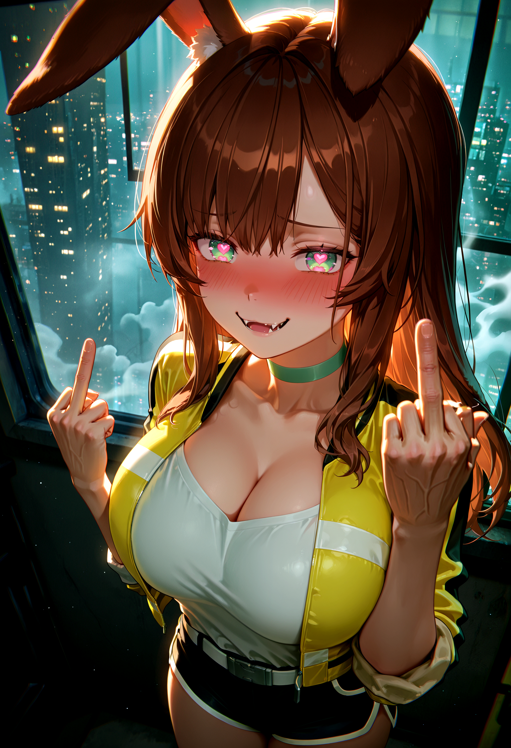 토끼 소녀, 동물 귀, 다색 눈, 녹색 눈, 분홍색 눈, 기호 모양의 동공, 하트 모양의 동공, 볼레기, 긴 머리, 갈색 머리, 앞머리, 큰 가슴,