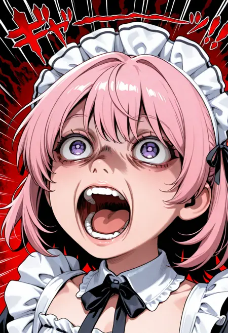 추가 태그: 왜곡된 얼굴, 기괴함, 미친 듯한 표정, 크게 뜬 눈, 작은 동공, 벌어진 입, 과장된 표현, 선형 하치징, 빨간 텍스트, 강조선,