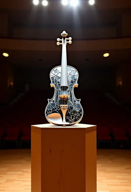 예시:fractured_mirror_morph, a violin built from mirror shards, reflective fragments, cinematic contrast, high detail, soft studio lighting