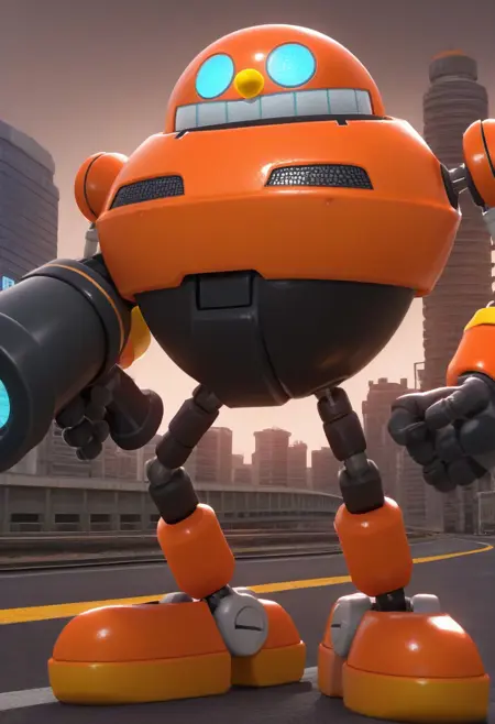 Egg Pawn, robot, orange round body and a dome-shaped head, blank cyan eyes, sharp yellow nose, a wide glowing panel for a mouth