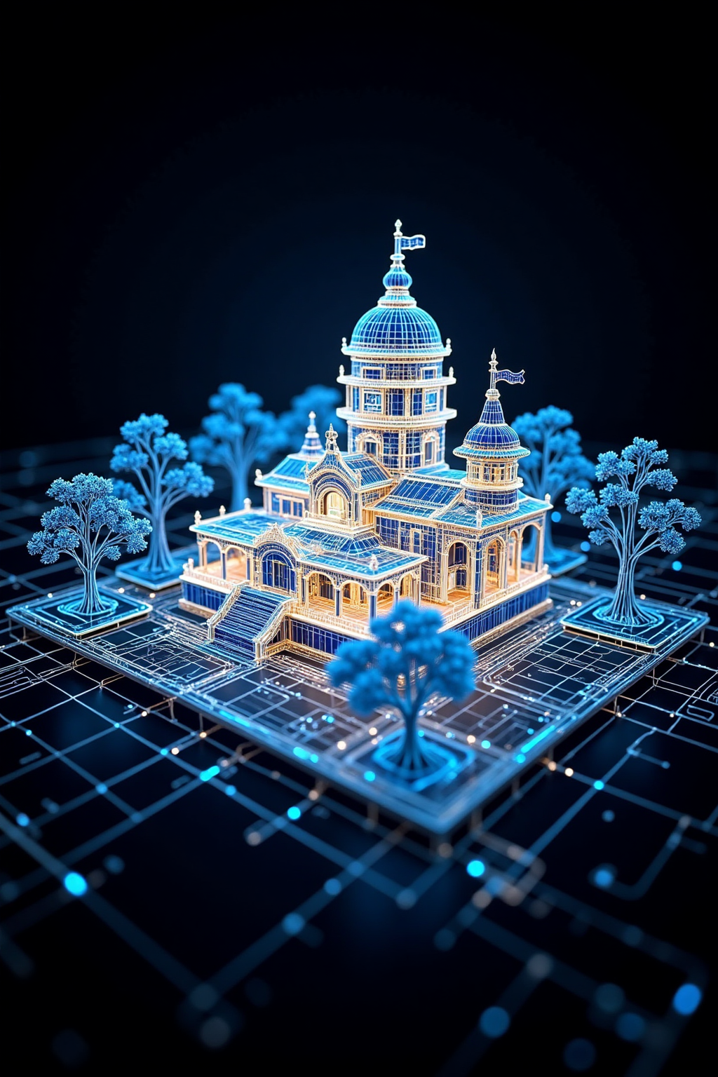 발광 효과가 있는 3D 와이어프레임 건축 모델, 웅장한 성, 파란 조명 나무, 떠있는 데이터 패널 표현.