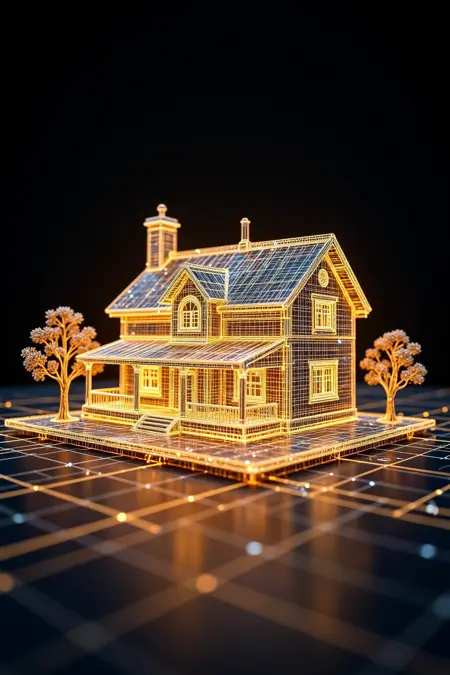 발광 효과가 있는 3D 와이어프레임 건축 모델, 포근한 2층 집, 따뜻한 조명, 작은 나무들 묘사.