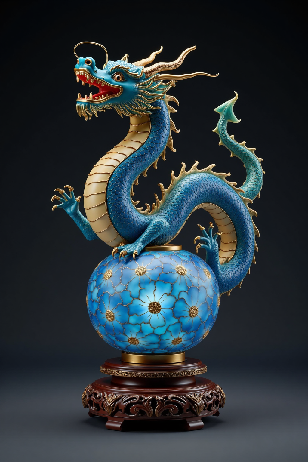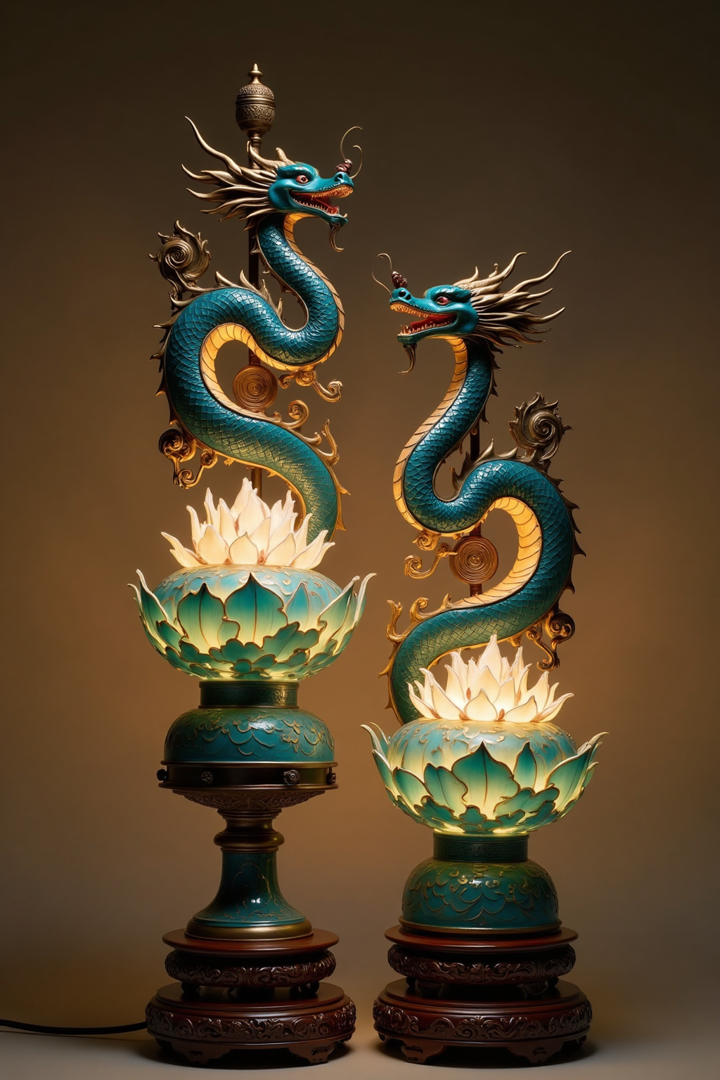 1. 동양 드래곤 테마 등, 고대 중국 궁전 스타일, 청록유약, 금색 드래곤 비늘, 부드러운 따뜻한 빛, 기초부의 정교한 나무 조각.