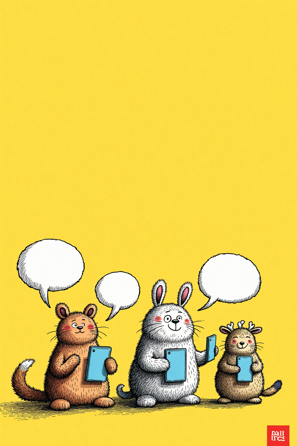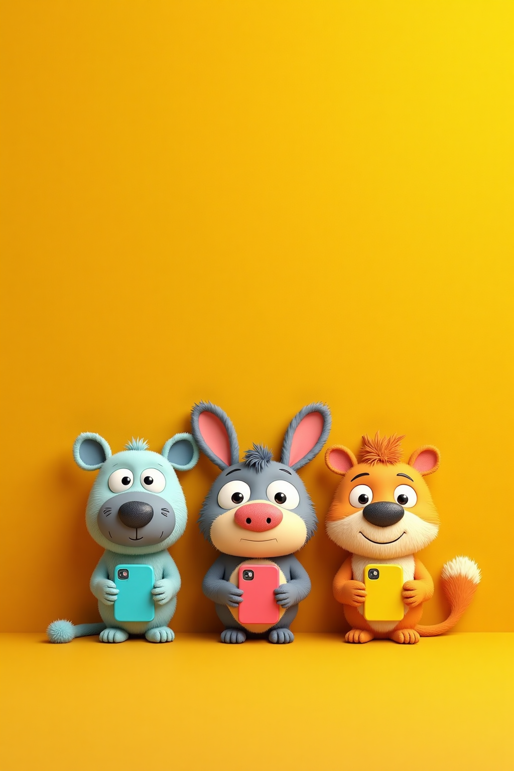 각 동물은 휴대폰을 들고 있습니다. 귀여운 3D 스타일 일러스트를 생성하세요, 밝은 노란색 배경, 부드러운 질감, 둥근 눈을 가진 동물들, 다양한 색상의 휴대폰, 단순하고 재미있게.