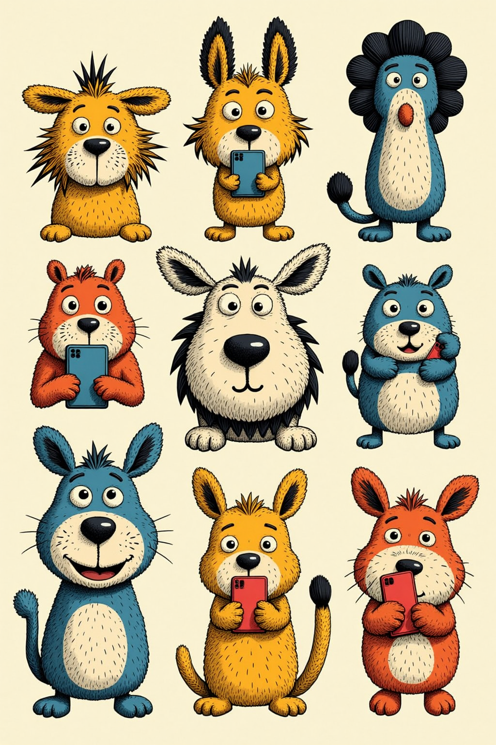 각 동물은 휴대폰을 들고 있습니다. 레트로 만화 스타일을 구현하세요, 두꺼운 검은 선, 생생한 원색, 과장된 표정을 가진 동물들, 오래된 기기 같은 휴대폰, 향수 어린 분위기.