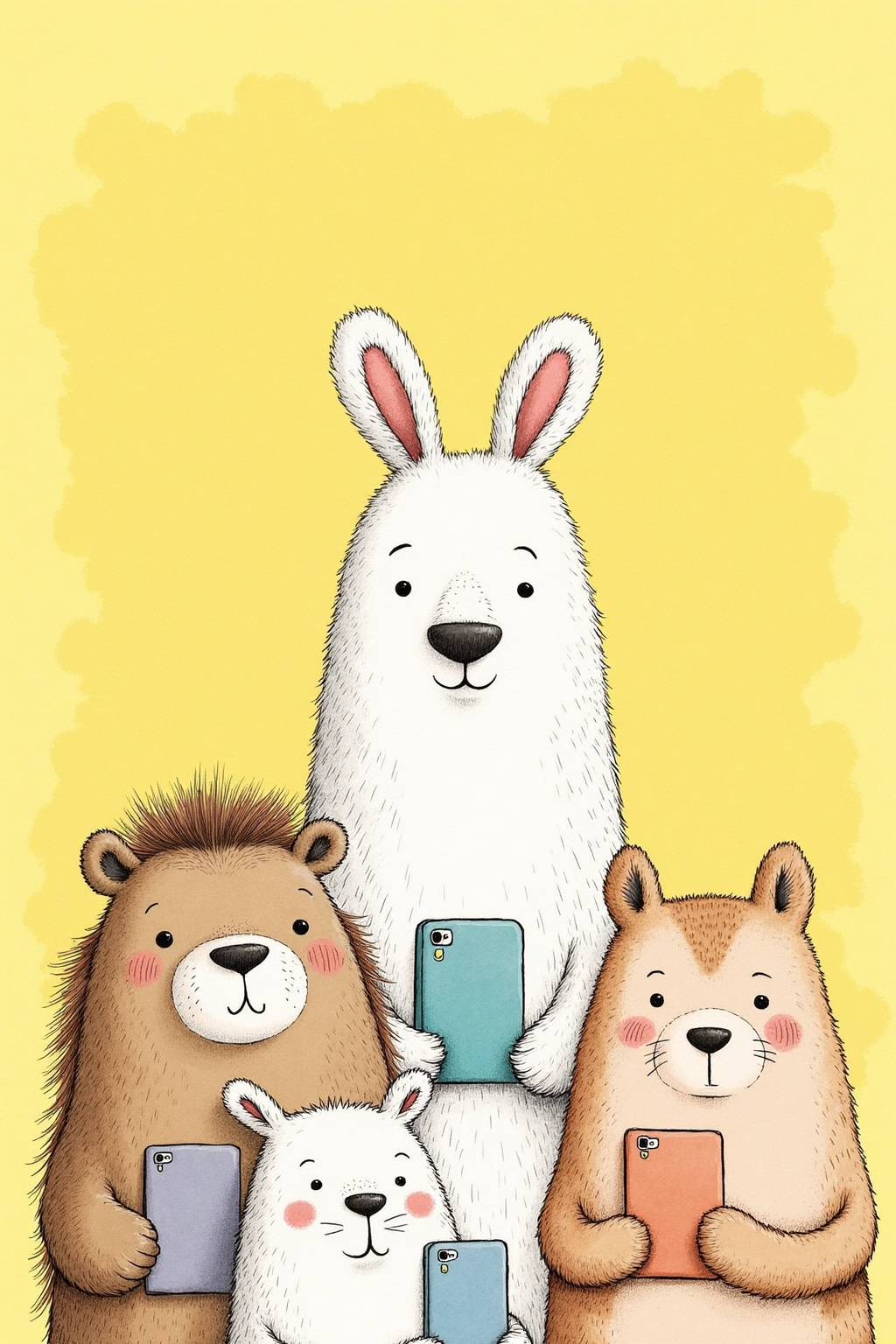 각 동물은 휴대폰을 들고 있습니다. 손으로 그린 스케치 스타일을 만들어주세요, 가벼운 연필 선, 스케치 스타일의 세부 사항을 가진 동물들, 단순한 만화 같은 휴대폰, 노란 종이 같은 질감.