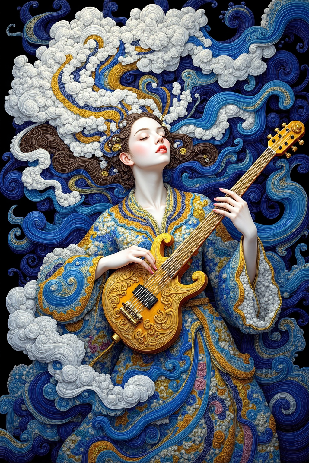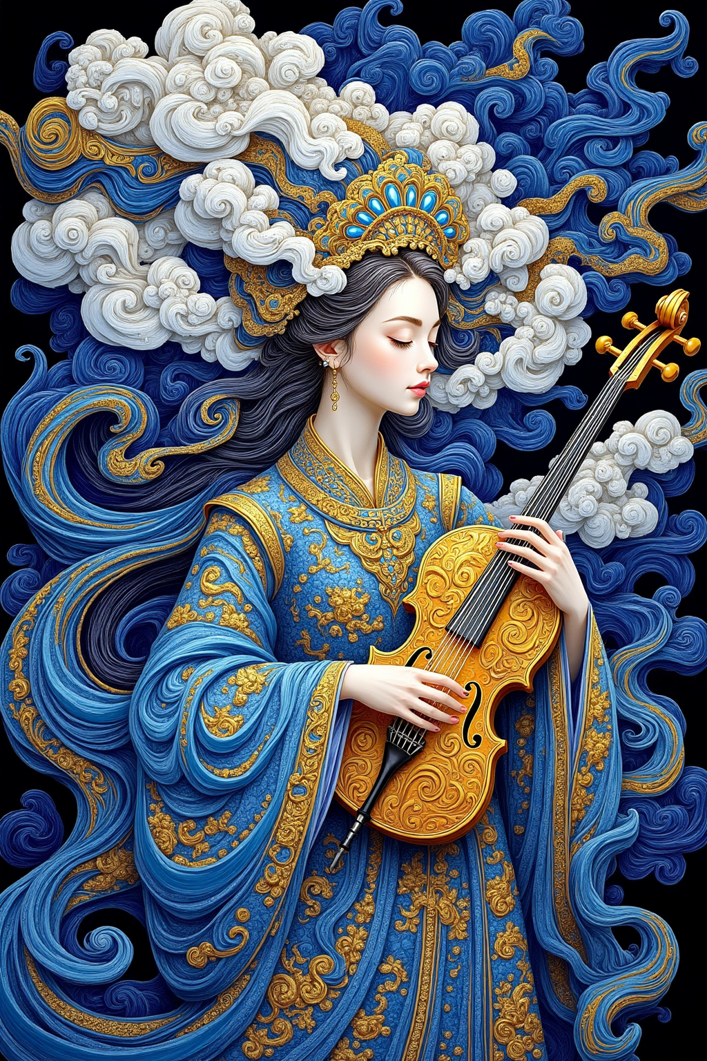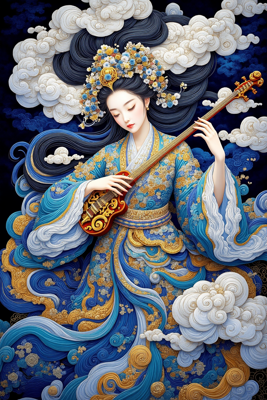 1. Fantasy art with musical figures, 중국 스타일 미인들이 흐르는 청-금색 옷을 입고, 구름과 신화적인 문양 사이에서 전통 악기를 연주하고 있다.