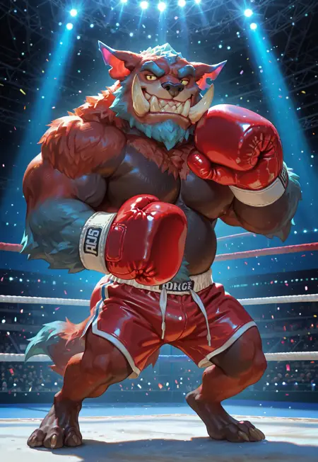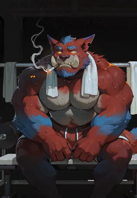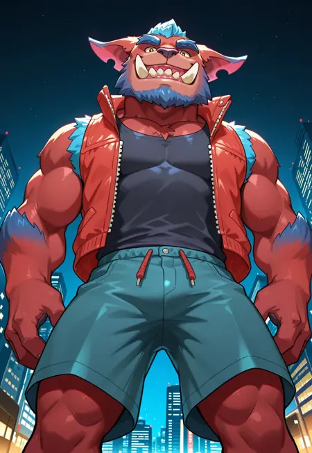 solo, male, anthro, muscular, m3g4gn4r, monster, tusks, amber eyes, fluffy tail, dipstick tail, claws