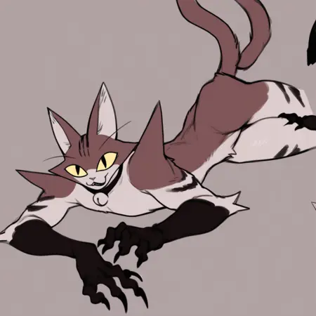 | 训练词汇 | Nyan, Anthro, cat, tall, slender, smile, Sharp teeth, yellow eyes, slit pupils, brown fur, white fur, two-tone fur, black nose, pointed ears, ear tufts, spiked shoulders, spiked elbows, sharp claws, pawpads, tail, black arms, black legs, black collar bell已复制! Menacing look, big creepy smile, wide eyes已复制! |