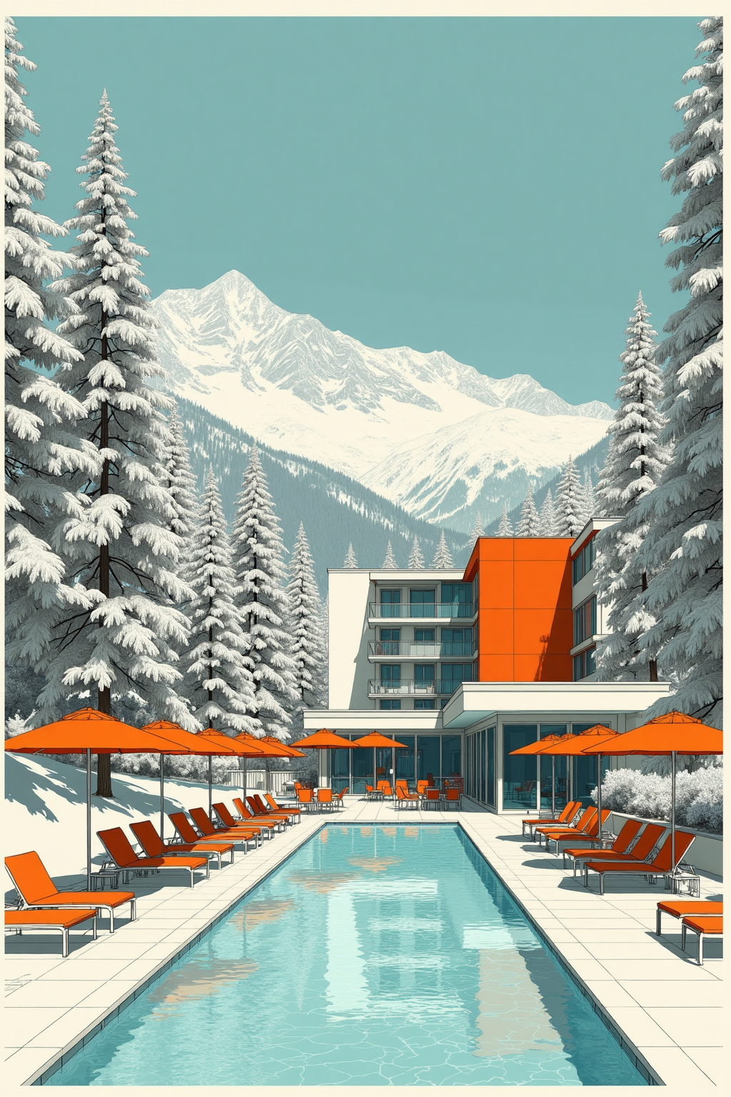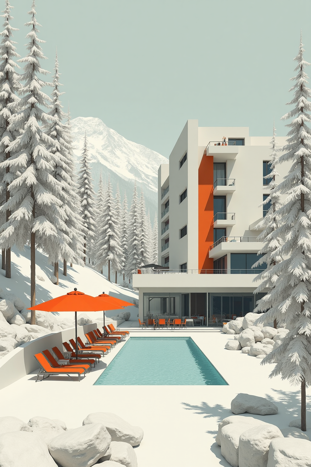 Same color scheme and architectural theme, imagine a minimalist alpine hotel, geometric forms, snow - laden trees, orange poolside shelters.
