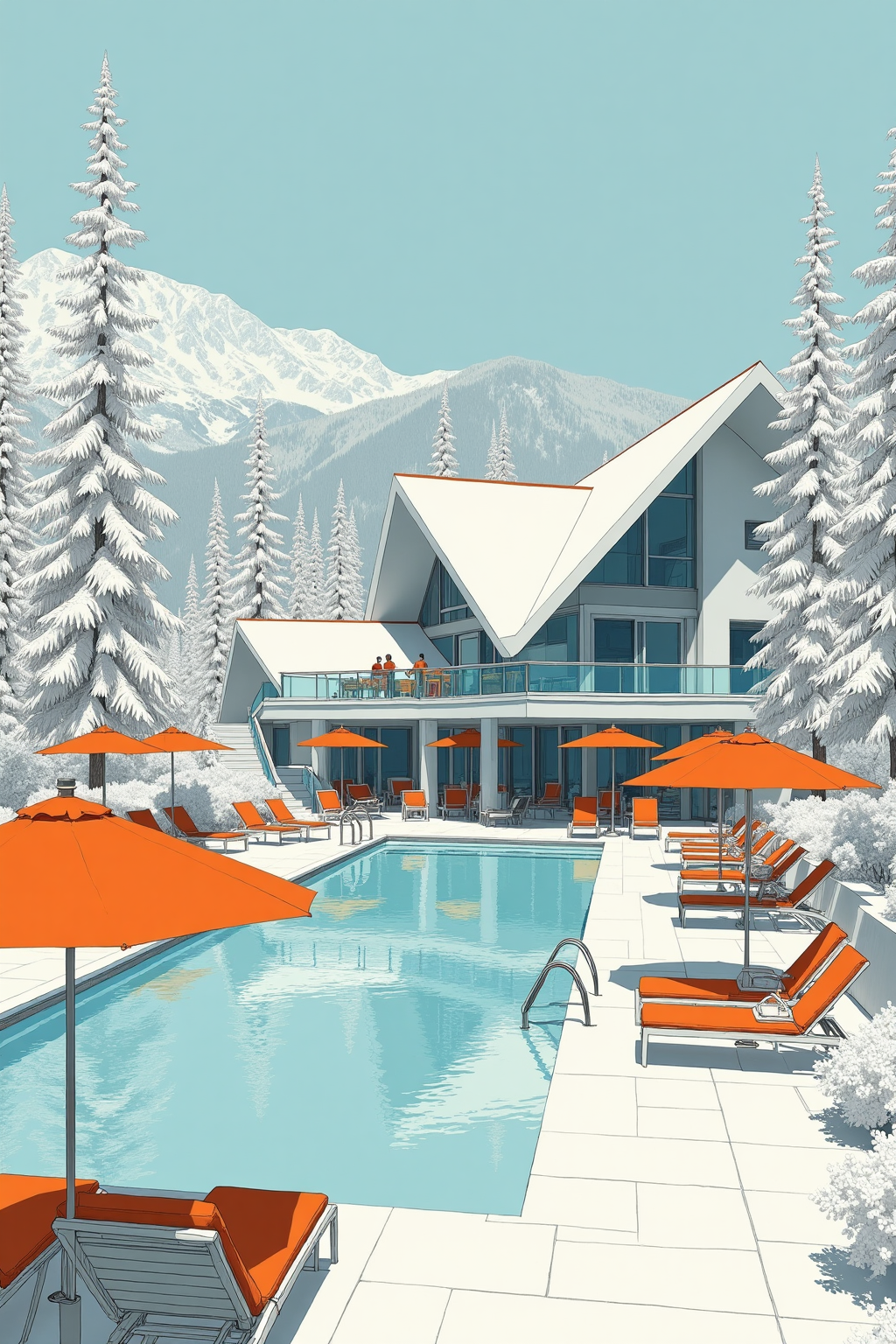 Same color scheme and architectural theme, draw a stylish mountain resort, modern architecture, snow - draped pines, orange pool umbrellas.