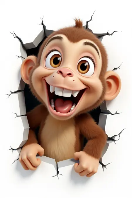 キャラクターが壁を破る、いたずらなサル、茶色の毛並み、にやりと笑う顔、白い背景、3D鮮やかなスタイル。
