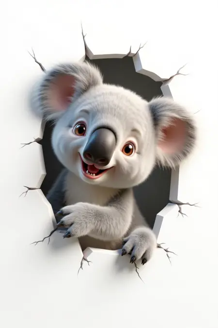 キャラクターが壁を破る、のんびりしたコアラ、灰色の毛並み、優しい表情、白い背景、3D温かみのあるトーンスタイル。