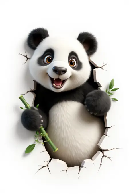 キャラクターが壁を破る、遊び好きなパンダ、黒白の体、竹を抱え、白い背景、3Dかわいらしいスタイル。