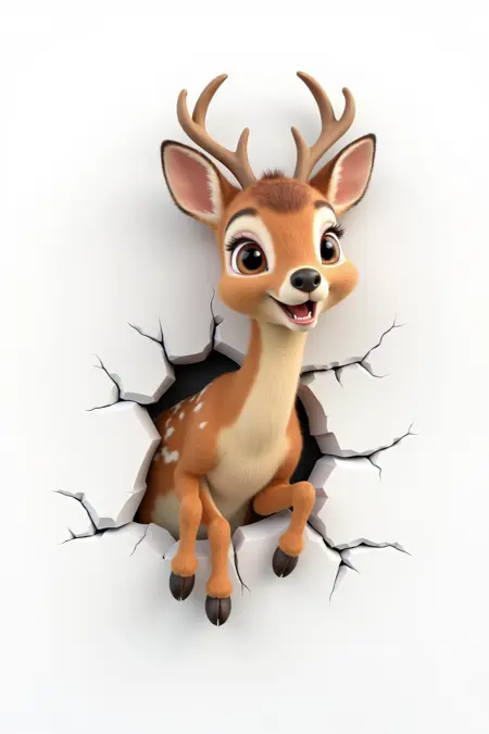 キャラクターが壁を破る、優雅なシカ、細長い脚、斑点模様の毛並み、白い背景、3D新鮮なスタイル。