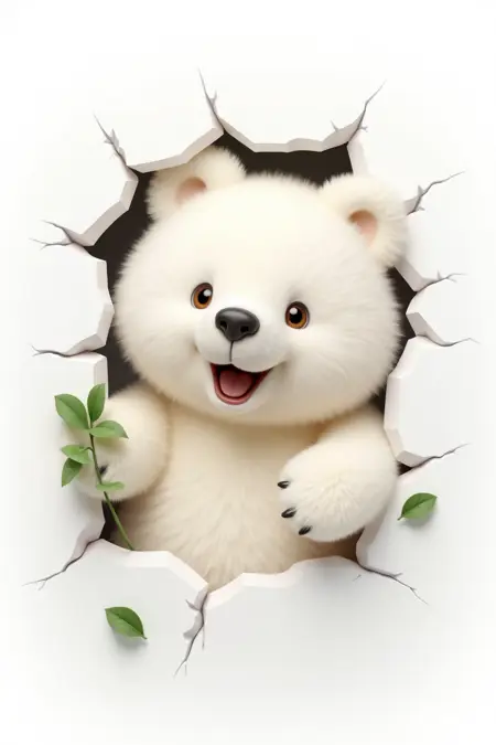 キャラクターが壁を破る、ふわふわの白いクマ、緑の葉を抱え、無邪気な表情、白い背景、3Dカワイイスタイル。