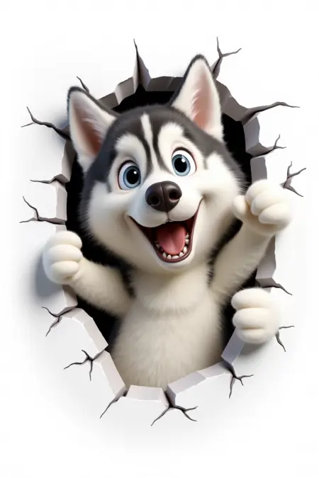 キャラクターが壁を破る、元気なハスキー、黒白の毛並み、口を開けた姿、白い背景、3Dリアルとアニメ混合スタイル。