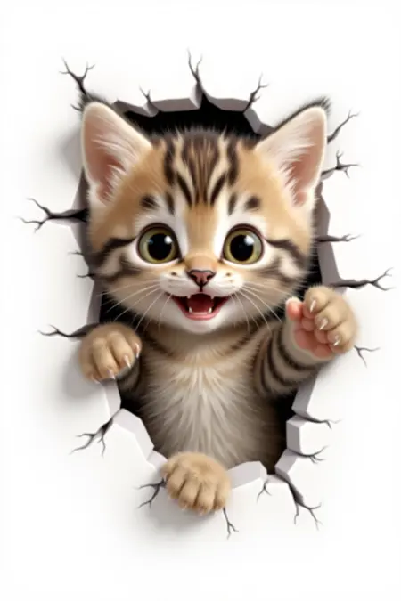キャラクターが壁を破る、大きな目を持つ可愛い子猫、縞模様の毛並み、笑顔、白い背景、鮮やかな3D効果。