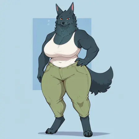 wolf, wolfgirl, black fur, red eyes, fluffy neck, black nose, wolf tail, large breasts, wide hips,