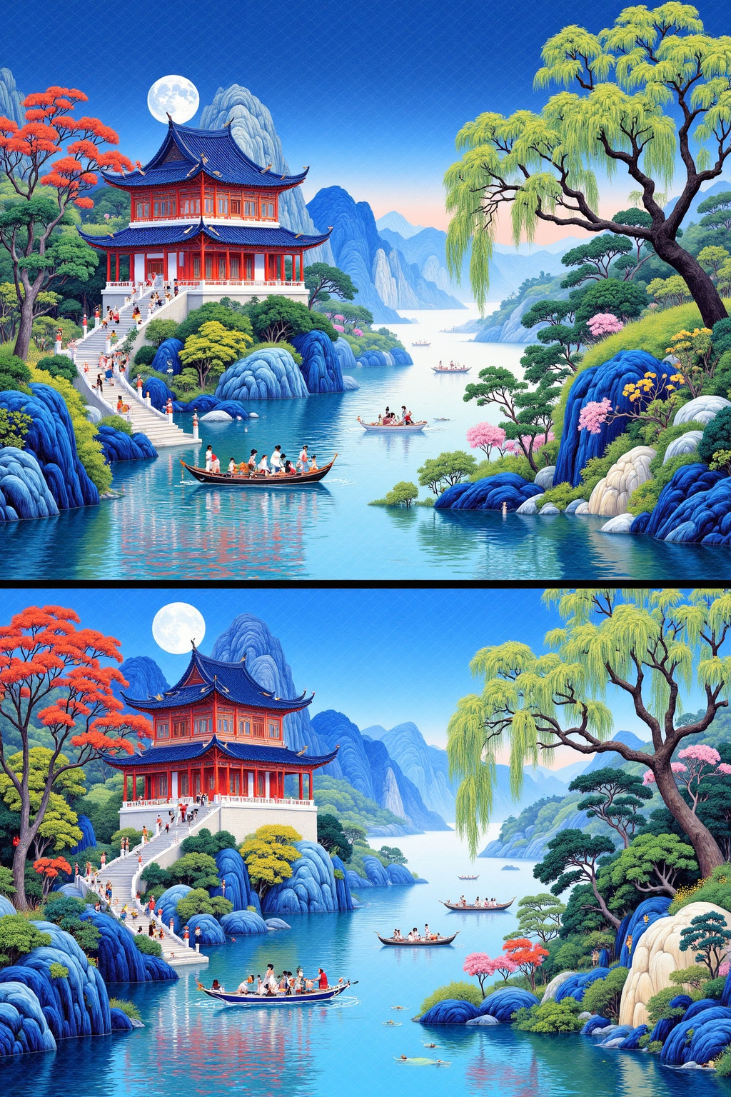 중국 스타일 풍경을 뛰어나게 생성할 수 있으며, 중국 스타일 일러스트나 장식화 제작에 적합합니다.