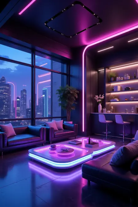 Neon lighting and futuristic interior design, a living room having layered neon lines, modular sofas, smart glass partitions, city - themed art.