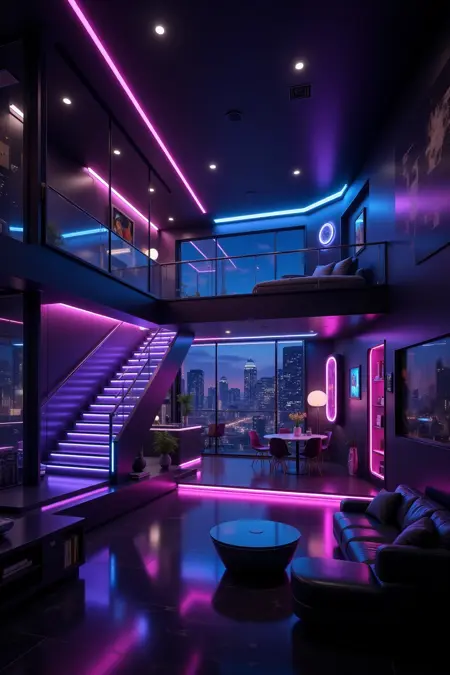 Neon lighting and futuristic interior design, a duplex living space with neon stair lighting, open - plan layout, city lights twinkling outside.