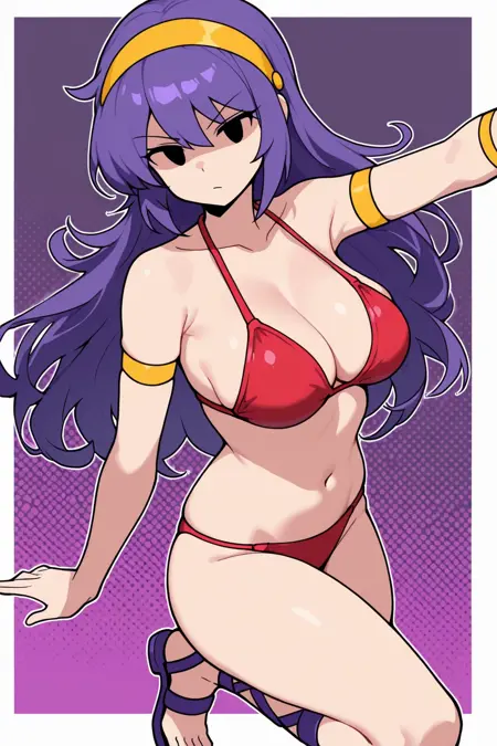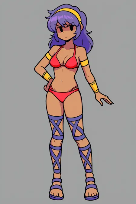 AthenaFNFCS, 1girl, tan skin, black eyes, no sclera, purple hair, red bikini, purple sandals, yellow headband, yellow arm bands, blue fishnet leggings,