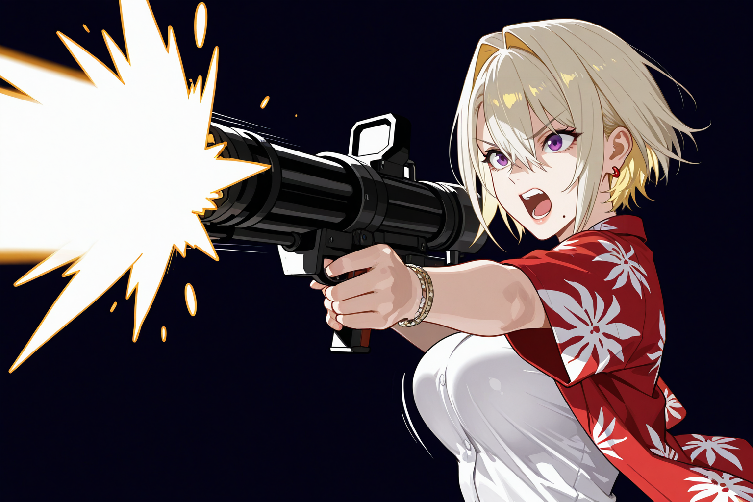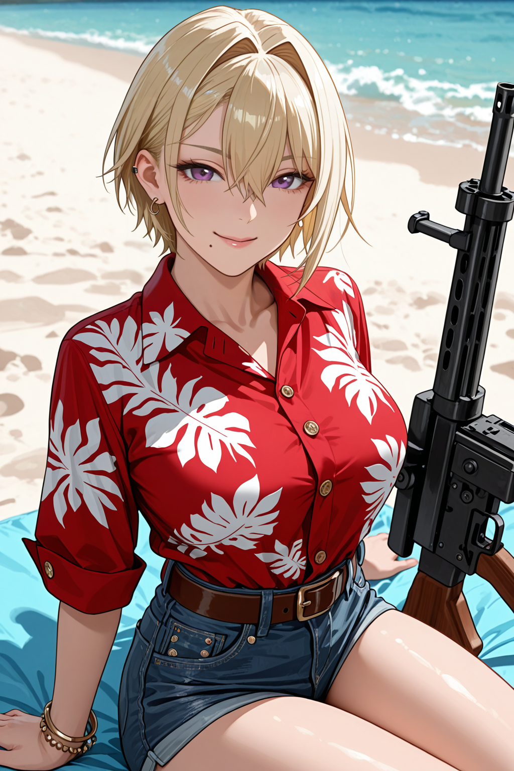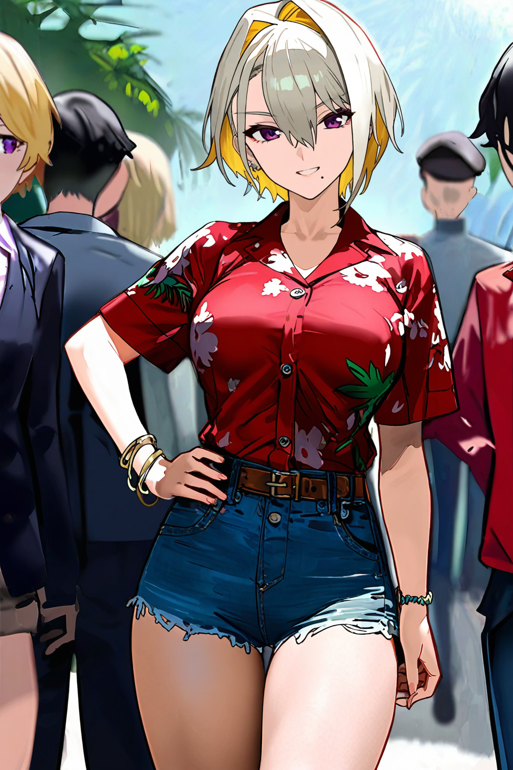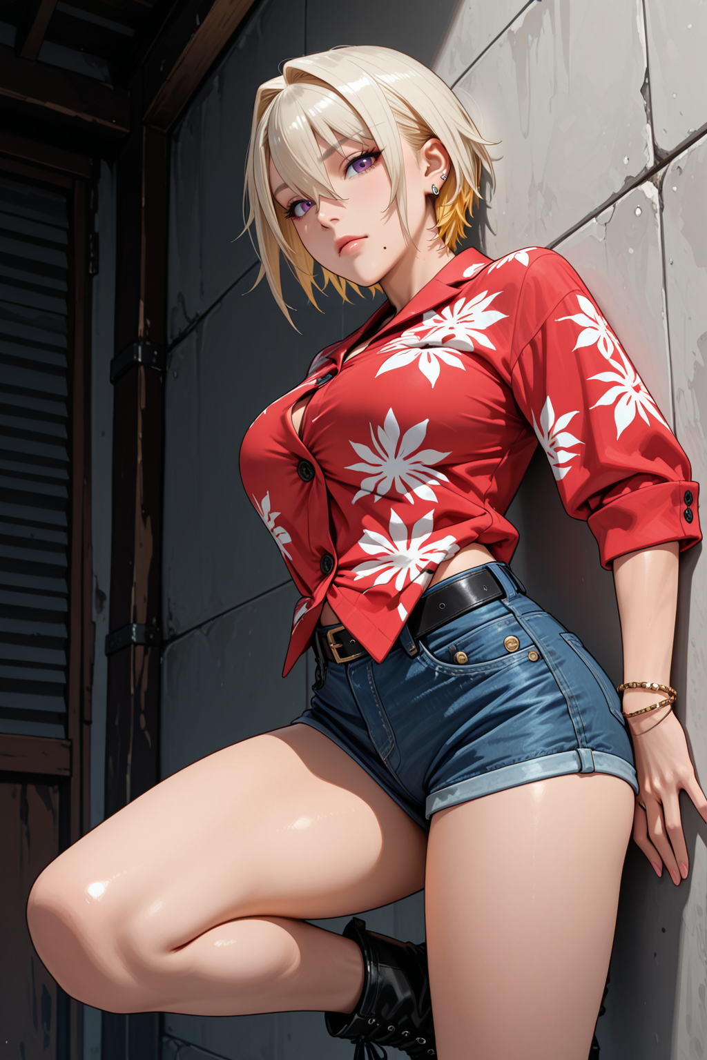 - トリガー(シャツ):mio、大きな胸、引き締まった体型、短い髪、(金髪:2)、髪の毛が目元にかかっている、紫の瞳、イヤリング、目元の髪、口の下のほくろ、耳 piercing、ジュエリー、ブレスレット、赤いハワイアンシャツ、(ボタン:2)、ベルト、デニムショートパンツ、コンバットブーツ