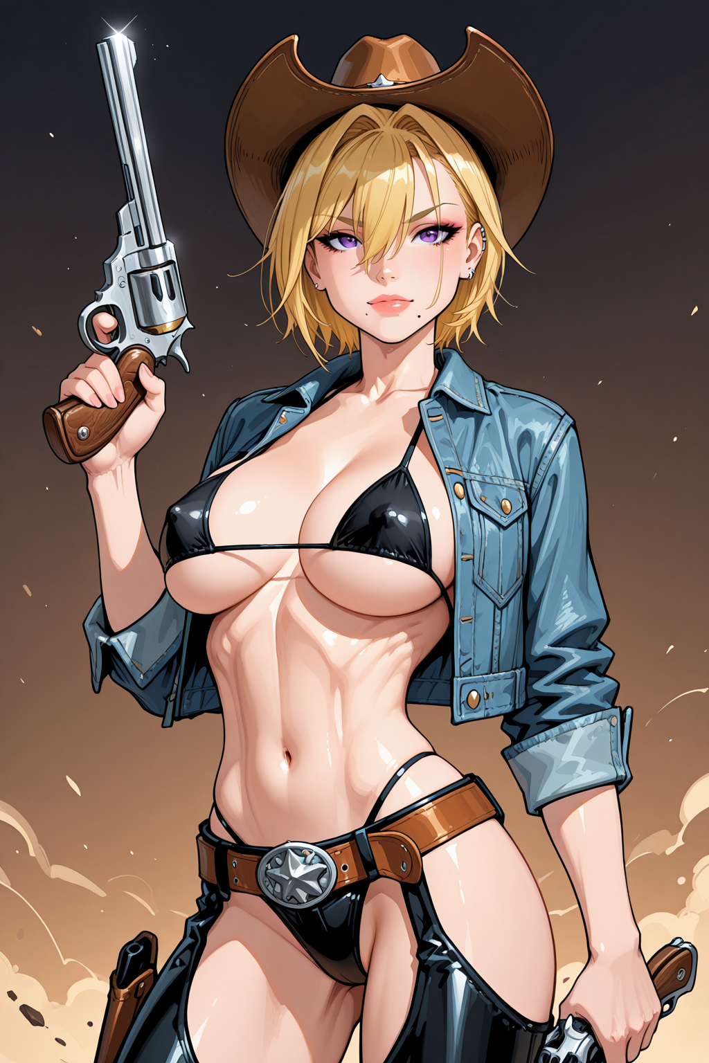 - トリガー(ビキニ):mio、大きな胸、引き締まった体型、短い髪、(金髪:2)、髪の毛が目元にかかっている、紫の瞳、イヤリング、ジュエリー、ブレスレット、目元の髪、口の下のほくろ、耳 piercing、サイドタイ式ビキニパンツ、ハイレグビキニ、マイクロビキニ