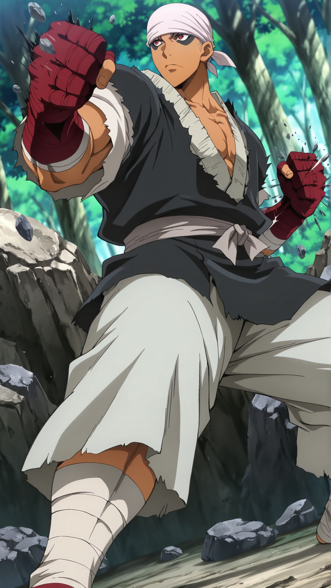 Appearance:dark-skinned male, red eyes, facepaint, black eyeshadow, muscular male,
