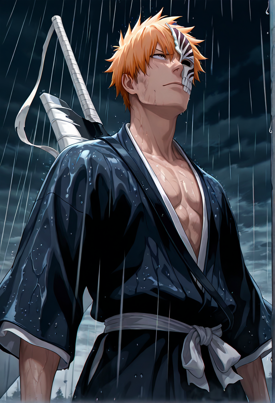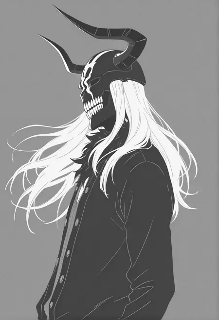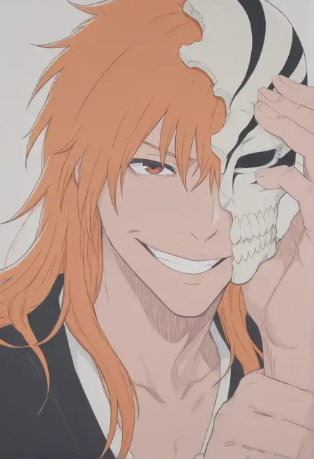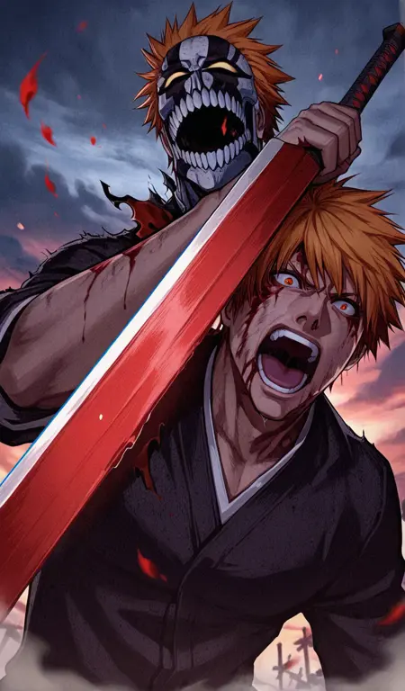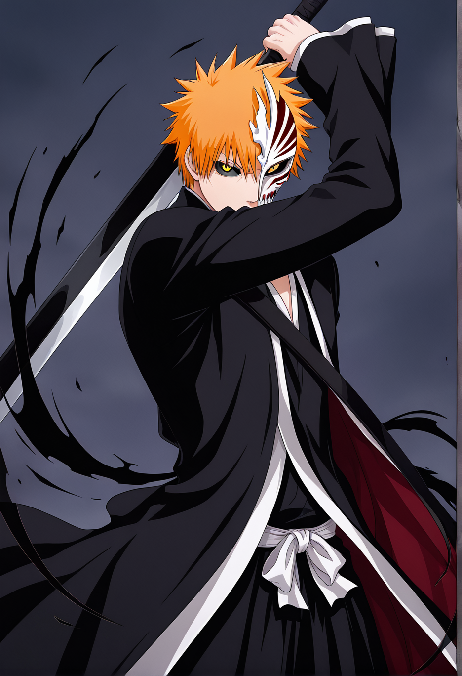 <lora:lora_ichigo_multi_form:1.0>, ichigoKRSK, form:hollow, outfit:shinigami, mask:hollow_partial,