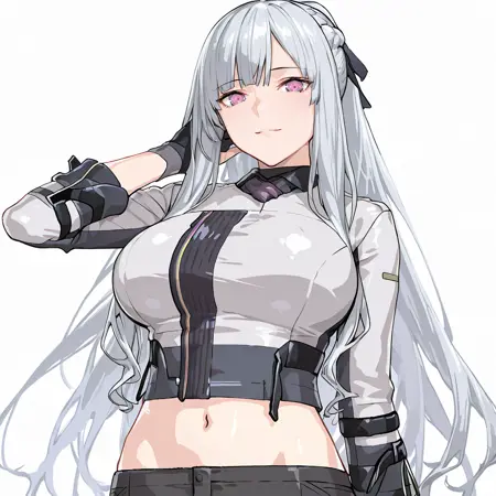 트리거: AK12, ak-12 (girls' frontline), 1girl, solo, long hair, large breasts, black pants, purple eyes, navel, partially fingerless gloves, french braid, midriff, bangs, hair ribbon, grey hair, artificial eye, long sleeves, sidelocks, mechanical eye, jacket, crop top, shirt