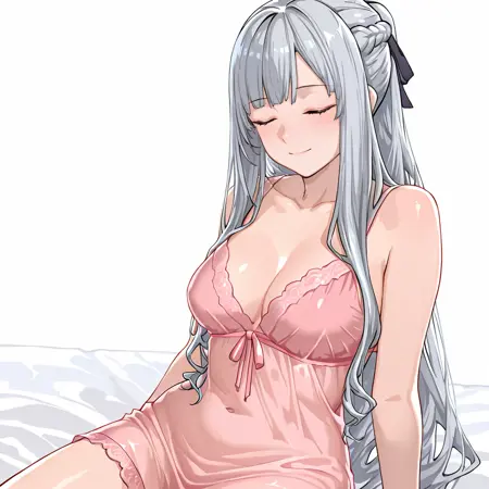 눈을 감은 트리거: AK12EyesClosed, 1girl, solo, ak-12 (girls' frontline), long hair, grey hair, black pants, tactical clothes, medium breasts, bangs, french braid, hair ribbon, shirt, sidelocks, long sleeves