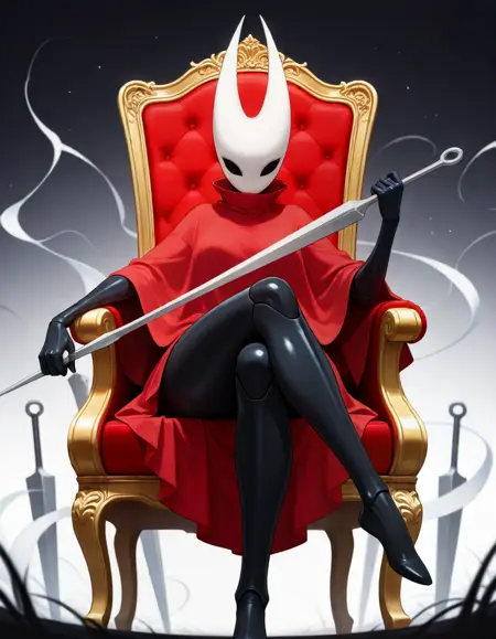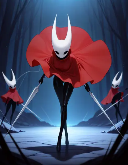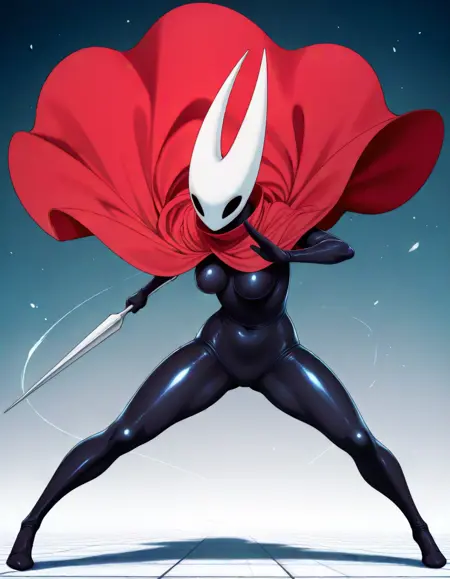 hollow knight silksong, hornet \(hollow knight\), 1girl, hollow eyes, black eyes, cloak, red cloak, arthropod girl, horns, holding weapon,fighting stance, kendo, impossible bodysuit, hornet \(hollow knight\),