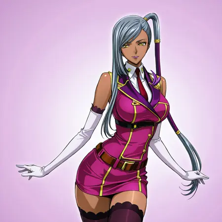 • 넥타이 포함 트리거: VillettaNuTie, 1girl, thighhighs, dark skin, dark-skinned female, elbow gloves, yellow eyes, long hair, grey hair, skirt, lipstick, makeup, purple lips, belt, breasts, side ponytail, miniskirt, necktie, zettai ryouiki