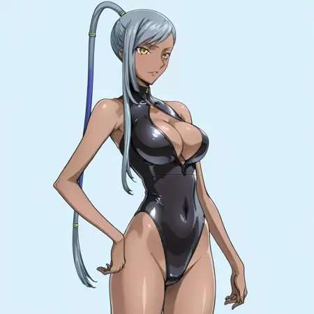 • 수영복 포함 트리거: VillettaNuSwimsuit, 1girl, dark-skinned female, fishnet thighhighs, dark skin, elbow gloves, grey hair, yellow eyes, large breasts, cleavage, lowleg bikini, side-tie bikini bottom, swimsuit, fishnets, underwear, panties, long hair, ponytail